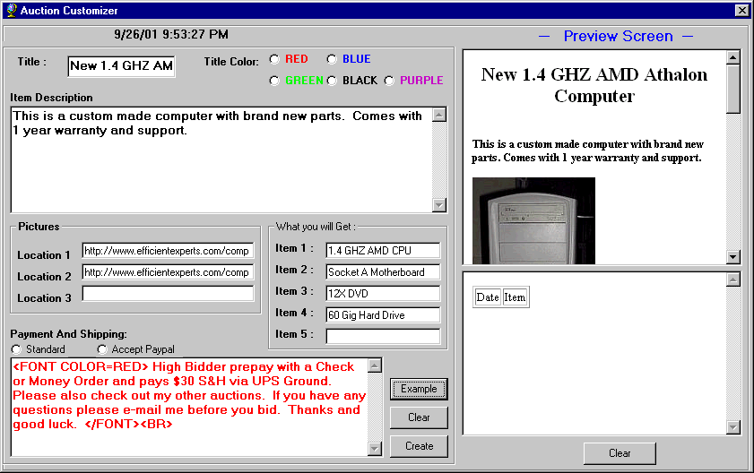 Want the fastest, easiest, and cheapest way to put up your product on ebay or any auction site? This can help you customize and show how your items will look like in seconds. And best of all this is free. Just answer a couple of questions and you are done. The preview window will show how your page will look everytime you make a change, so you get instant feedback.